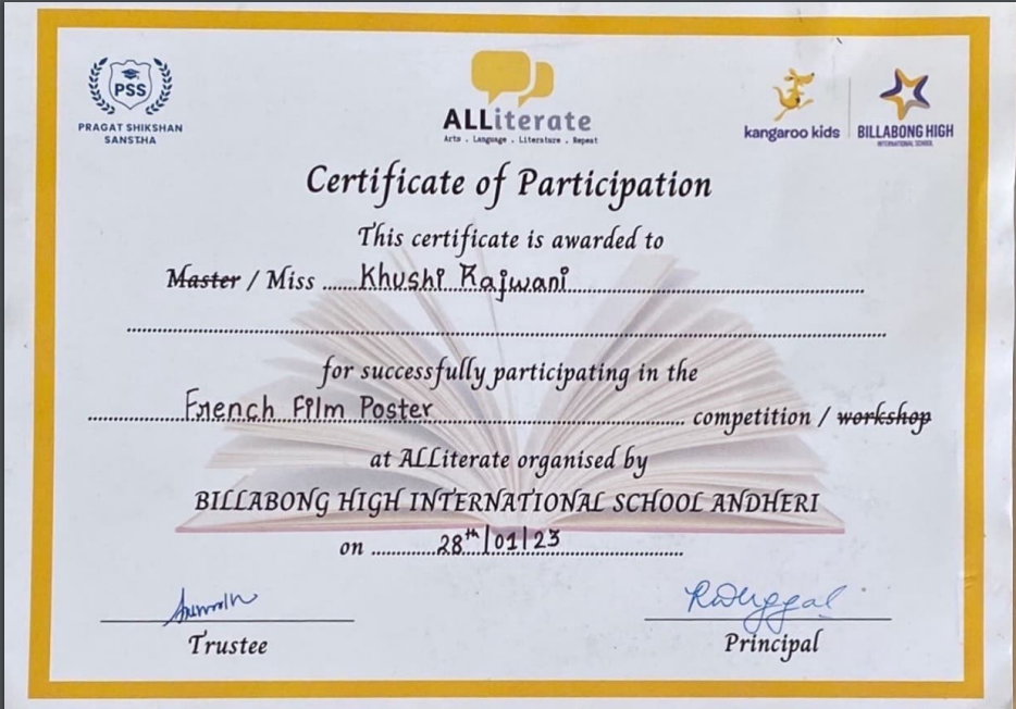I participated in French Film Poster Making competiton – Alliterate organised by Billabong High International School wherein I created an advertisement poster of a French film “La Geurre Des Bouttons”.