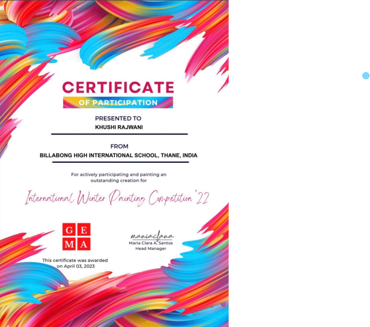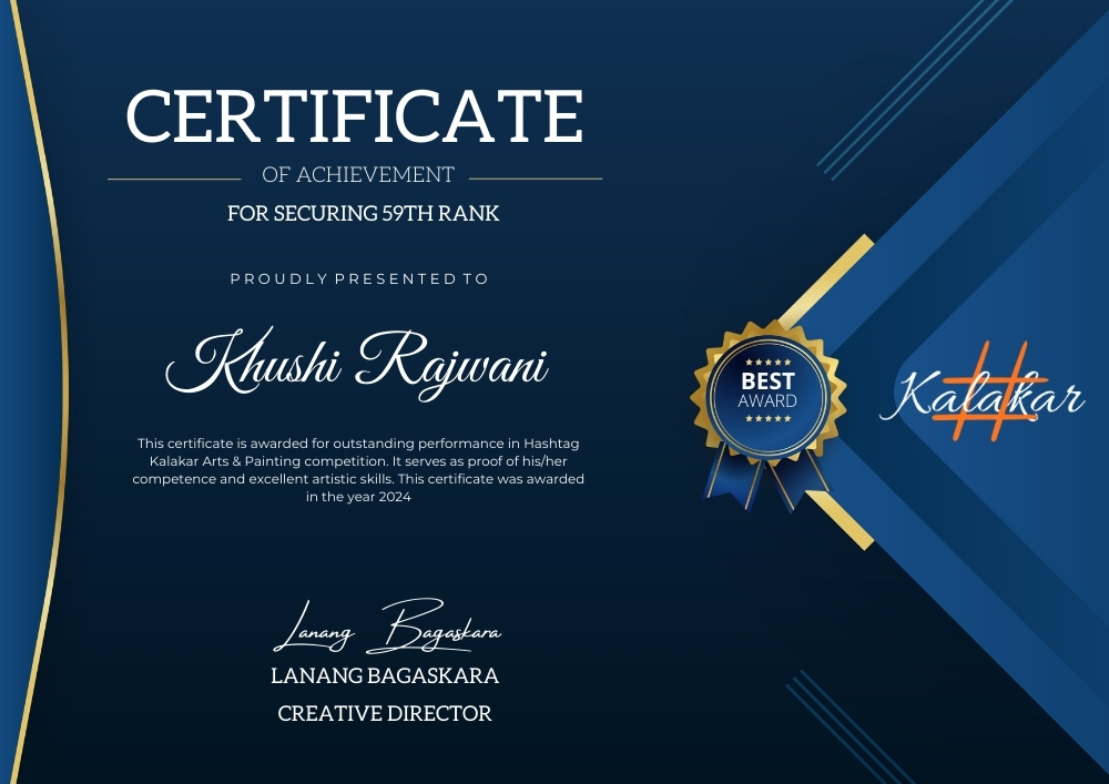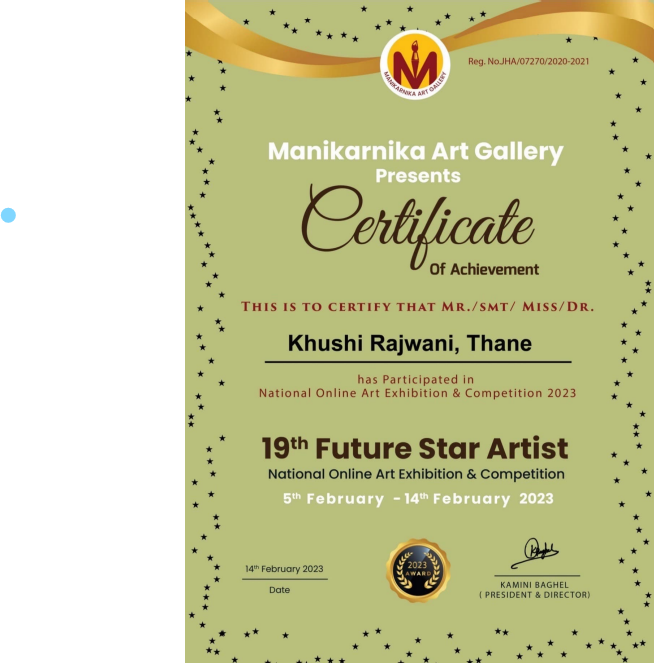 Participated in an online competition by Hashtag Kalakar in 2023 and 2024. In 2023, I secured the 50th rank out of 83000+ participants. In 2024, I secured the 59th rank out of 1,64,000+ participants. My paintings were also published in the Hashtag Kalakar special edition magazine.